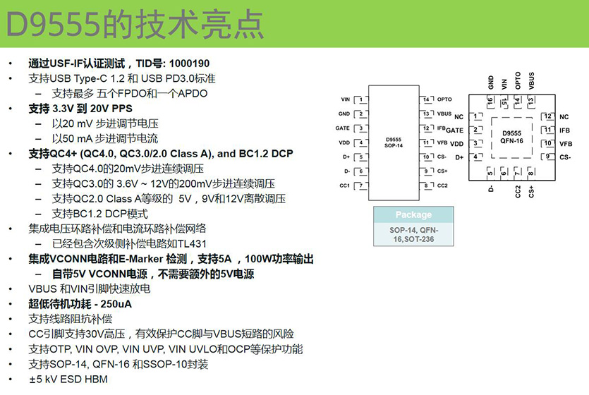 ● 2018年更是采用先进的,可擦写编程的DSP智能化技术,成功开发USB PD,QC 快充协议IC--D9555, 其技术指标符合当下主流的PD3.0,Q4+的快充要求,并向下兼容PD2.0,QC2.0,QC3.0,QC4.0, 因其外围元件小,设计简单而被受市场广泛期待,其性能领先同行竞争对比。